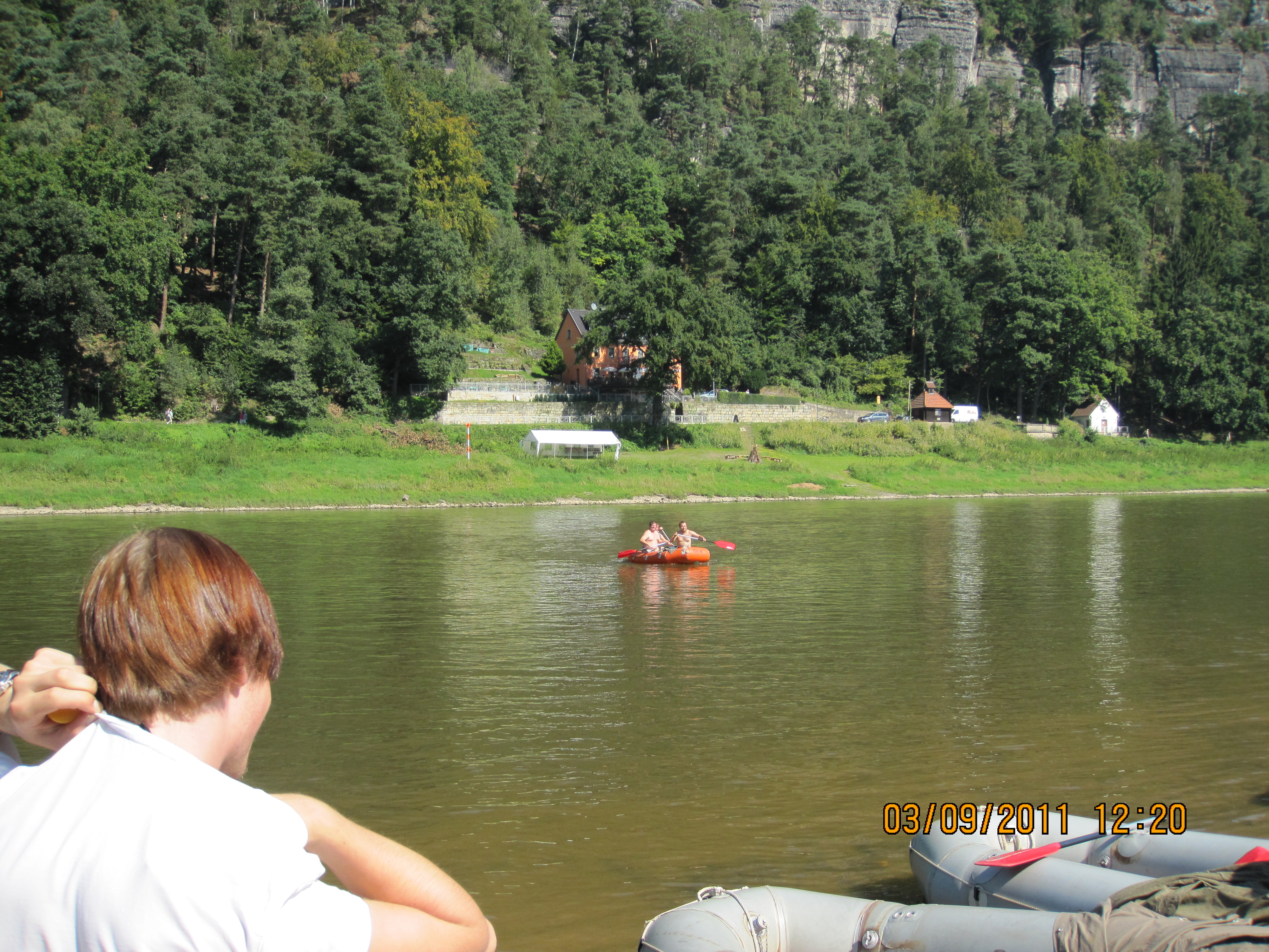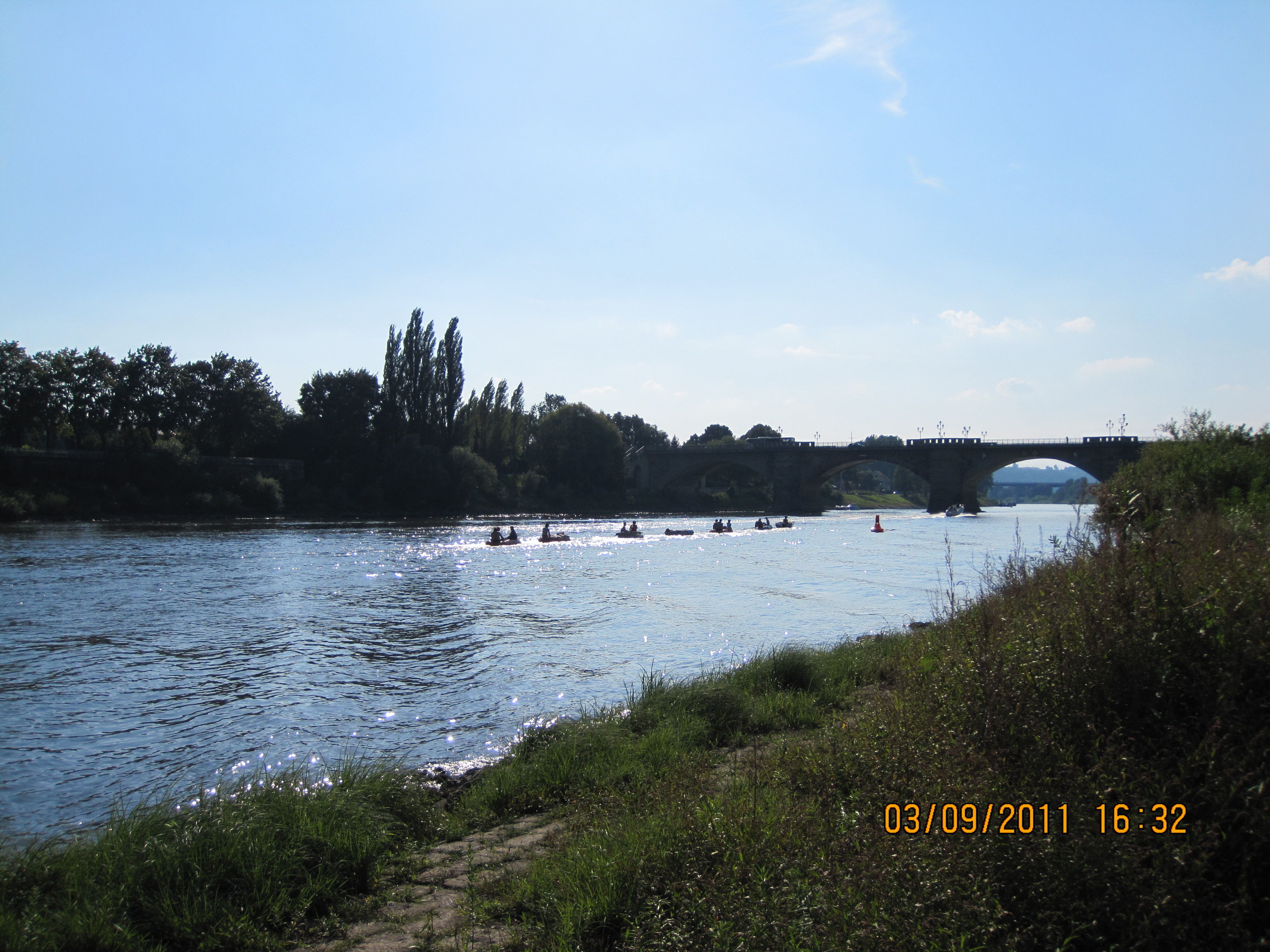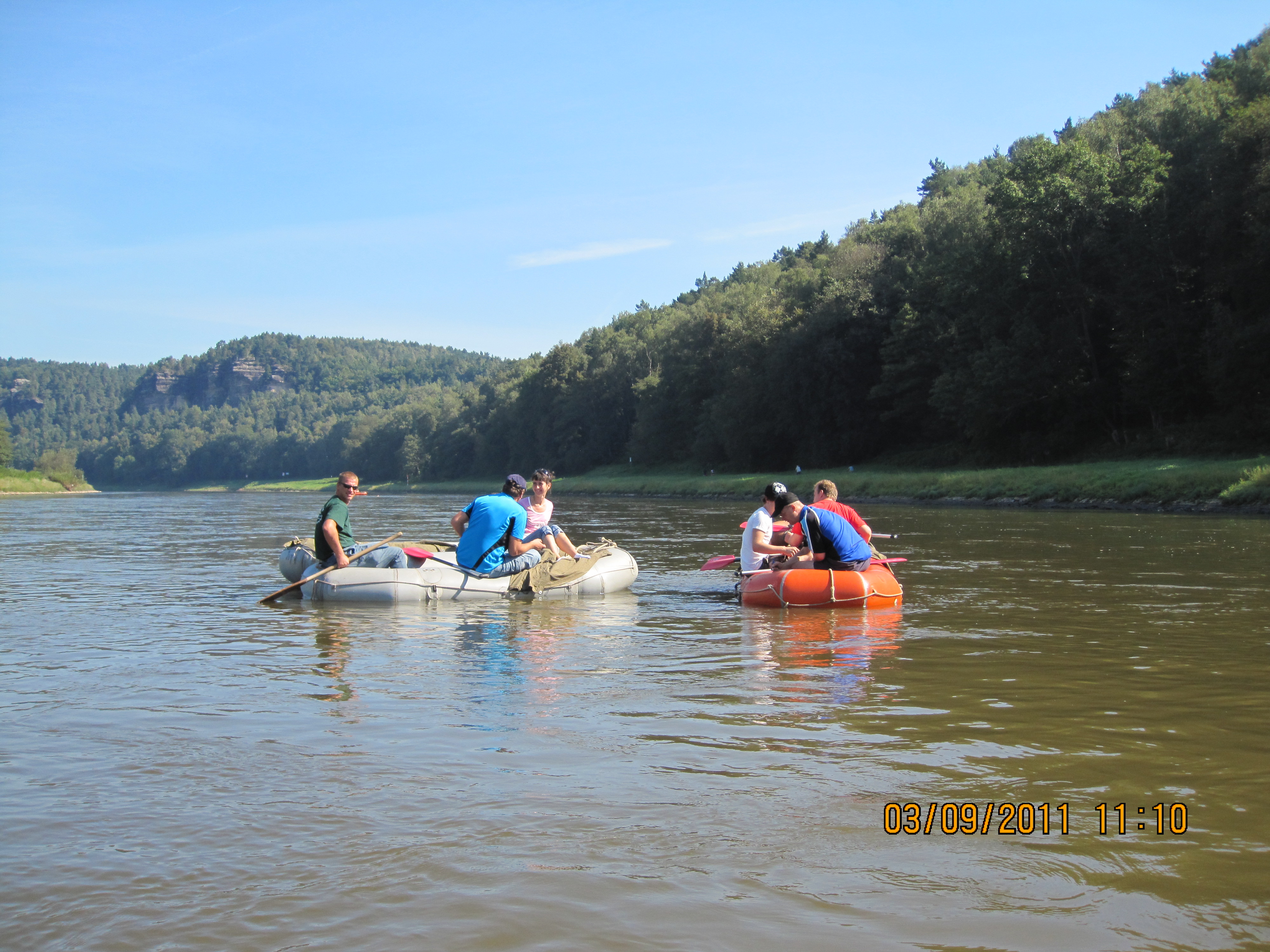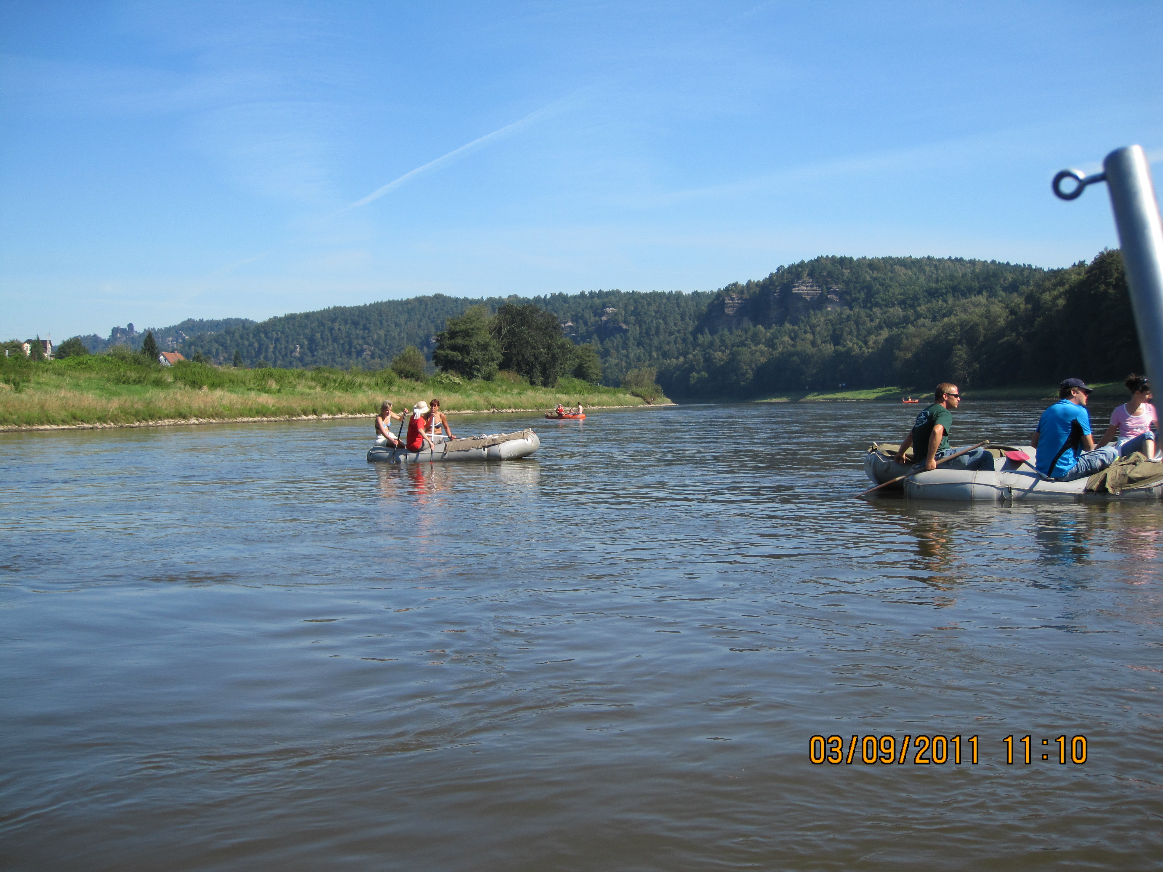 Am Morgen des 3. Septembers ging es im Konvoi aus Chemnitz Richtung Elbsandsteingebirge. Bei wunderbarem Sommerwetter wurden unterhalb der Festung Königstein die Schlauchboote aufgebaut und zu Wasser gelassen. Durch die hohe Strömungsgeschwindigkeit der Elbe in diesem Flussabschnitt wurden Paddel nur zum Steuern verwendet. Am Vormittag ging es vorbei am Kurort Rathen und an der wunderbaren Kulisse der Sandsteinfelsen. Unterhalb der Bastei wurden die Boote ans Ufer gelenkt und eine lange Mittagspause eingeschoben. Danach ging es, nicht ohne eine weitere Pause, an der Stadt Wehlen vorbei in Richtung Pirna. Auf dem Gelände des dortigen Kanuvereins verbrachten wir einen wunderbaren Abend mit Grillfleisch und Lagerfeuer. Am nächsten Morgen floss nicht nur die Elbe weiter flussabwärts, sondern zeigte sich auch die Sonne wieder von ihrer besten Seite. Vorbei ging es am Schloss Pilnitz und dem Blauen Wunder. Am Nachmittag erreichten wir mit unseren 8 Schlauchbooten und einem motorisierten Begleitboot die Dresdner Altstadt. Danach ging es noch eine Stunde bis zum Zielpunkt in Dresden-Cotta, bevor es sonnengebräunt wieder in Richtung Heimat ging.