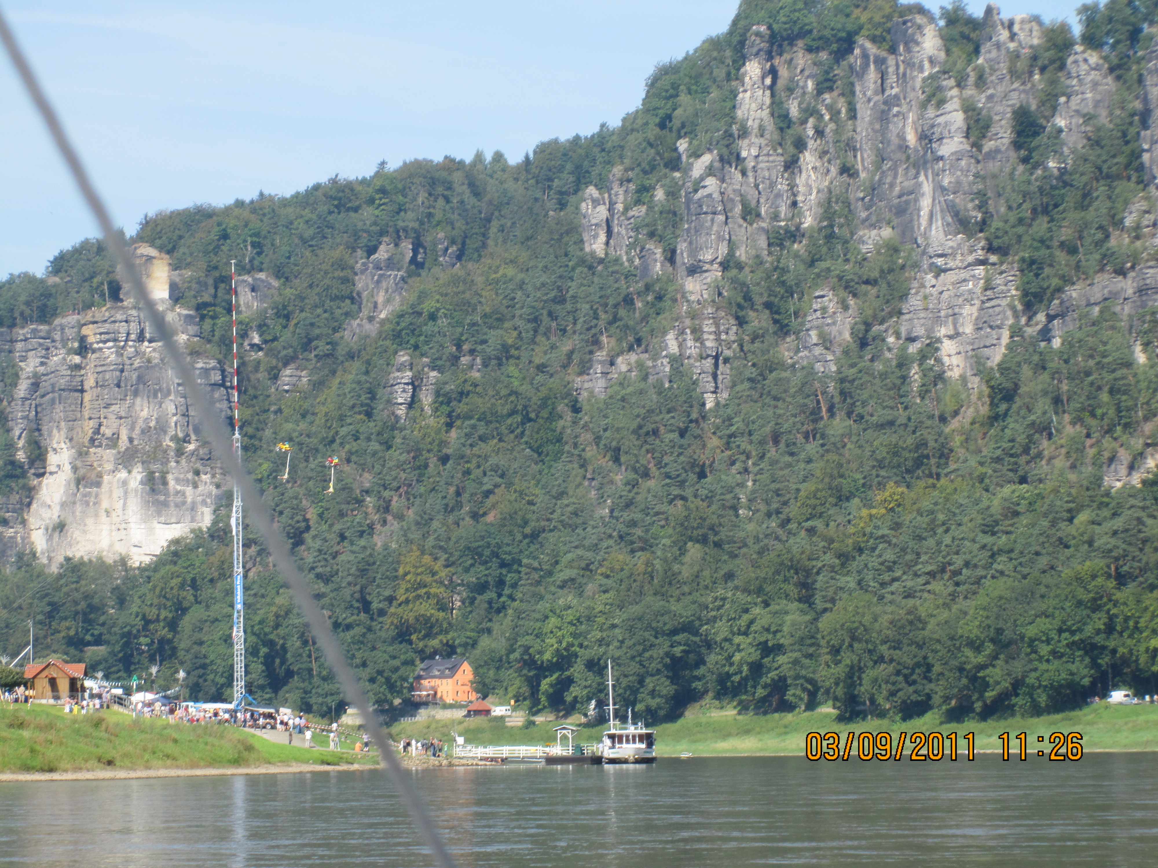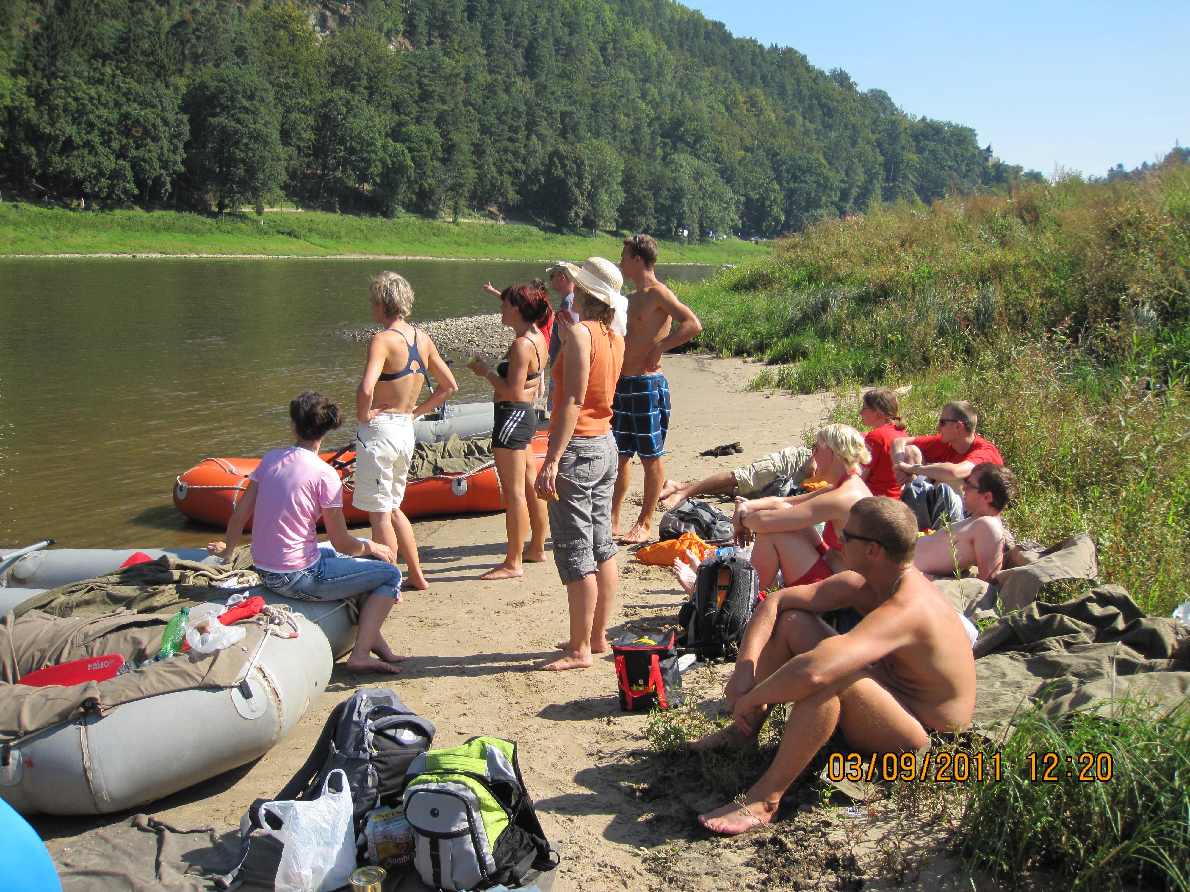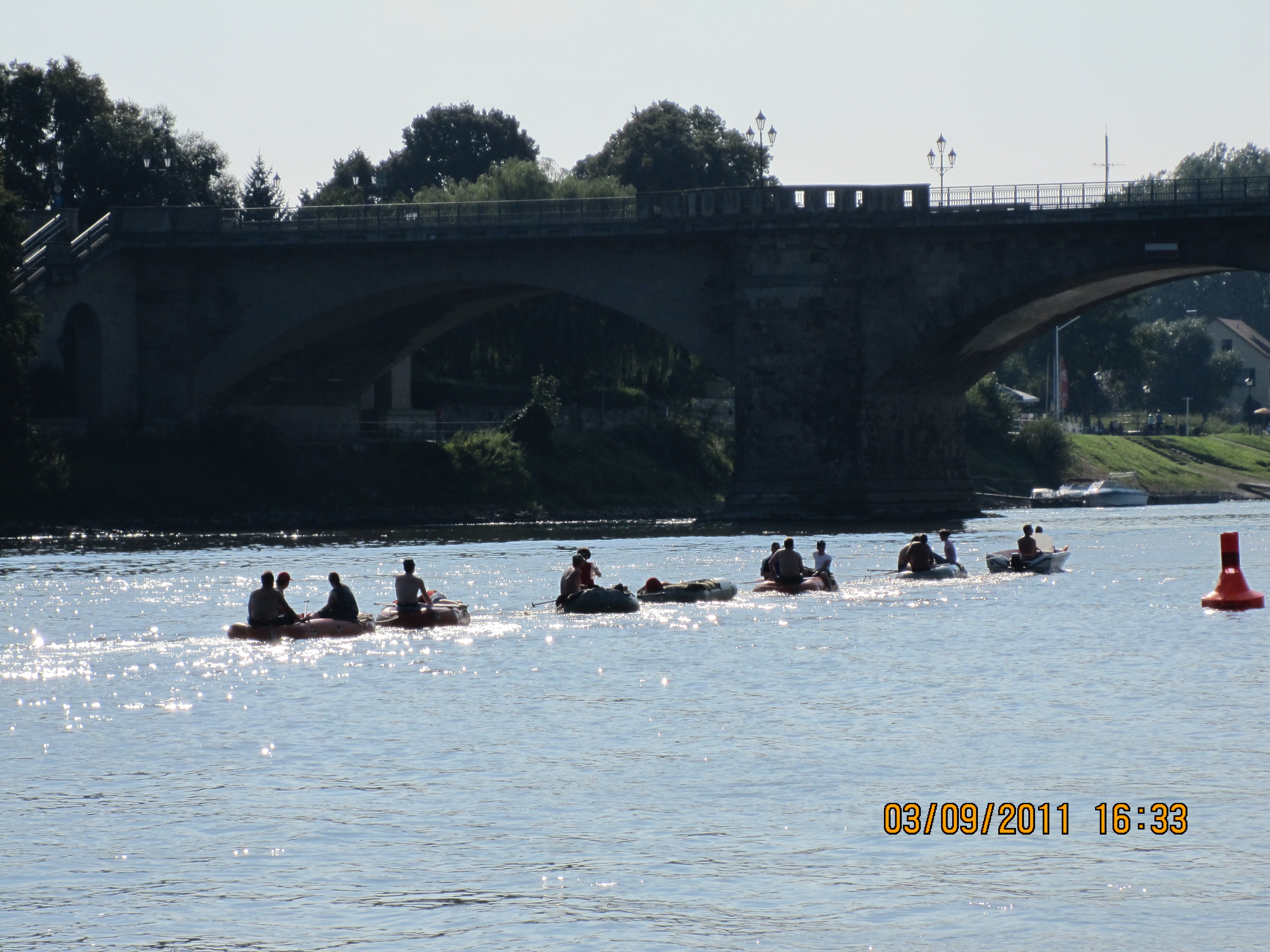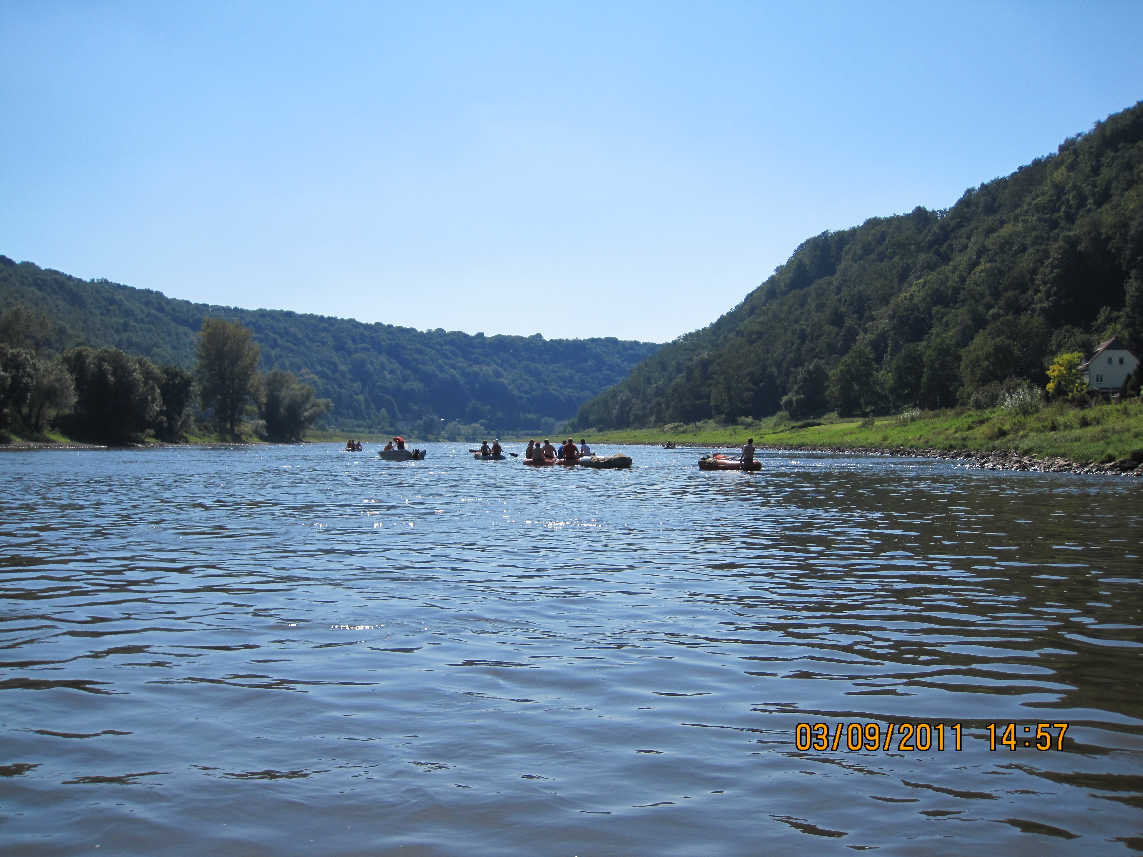 Am Morgen des 3. Septembers ging es im Konvoi aus Chemnitz Richtung Elbsandsteingebirge. Bei wunderbarem Sommerwetter wurden unterhalb der Festung Königstein die Schlauchboote aufgebaut und zu Wasser gelassen. Durch die hohe Strömungsgeschwindigkeit der Elbe in diesem Flussabschnitt wurden Paddel nur zum Steuern verwendet. Am Vormittag ging es vorbei am Kurort Rathen und an der wunderbaren Kulisse der Sandsteinfelsen. Unterhalb der Bastei wurden die Boote ans Ufer gelenkt und eine lange Mittagspause eingeschoben. Danach ging es, nicht ohne eine weitere Pause, an der Stadt Wehlen vorbei in Richtung Pirna. Auf dem Gelände des dortigen Kanuvereins verbrachten wir einen wunderbaren Abend mit Grillfleisch und Lagerfeuer. Am nächsten Morgen floss nicht nur die Elbe weiter flussabwärts, sondern zeigte sich auch die Sonne wieder von ihrer besten Seite. Vorbei ging es am Schloss Pilnitz und dem Blauen Wunder. Am Nachmittag erreichten wir mit unseren 8 Schlauchbooten und einem motorisierten Begleitboot die Dresdner Altstadt. Danach ging es noch eine Stunde bis zum Zielpunkt in Dresden-Cotta, bevor es sonnengebräunt wieder in Richtung Heimat ging.